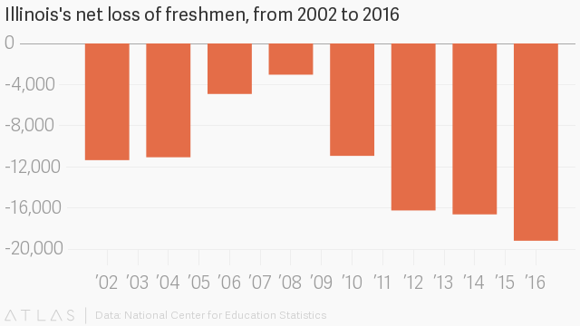 Sure enough, since the impasse began, enrollments at many Illinois public universities have slid precipitously from year to year. (Just this fall, freshman enrollment at Western Illinois University fell by 21 percent.) And preliminary data indicate that a greater number of freshmen sought higher education outside the state, while fewer out-of-state students chose to study in the Land of Lincoln. In 2016, the state experienced a net loss of 19,195 students, a 15-percent increase from 2014’s 16,000-student gap, and second only to New Jersey’s 29,000-freshmen deficit. The deepening loss was largely driven by more Illinois residents seeking to study in other states.